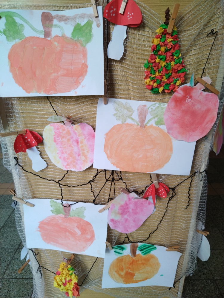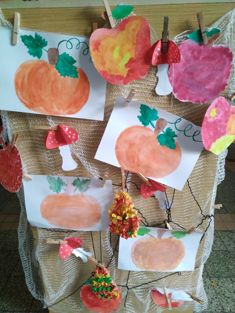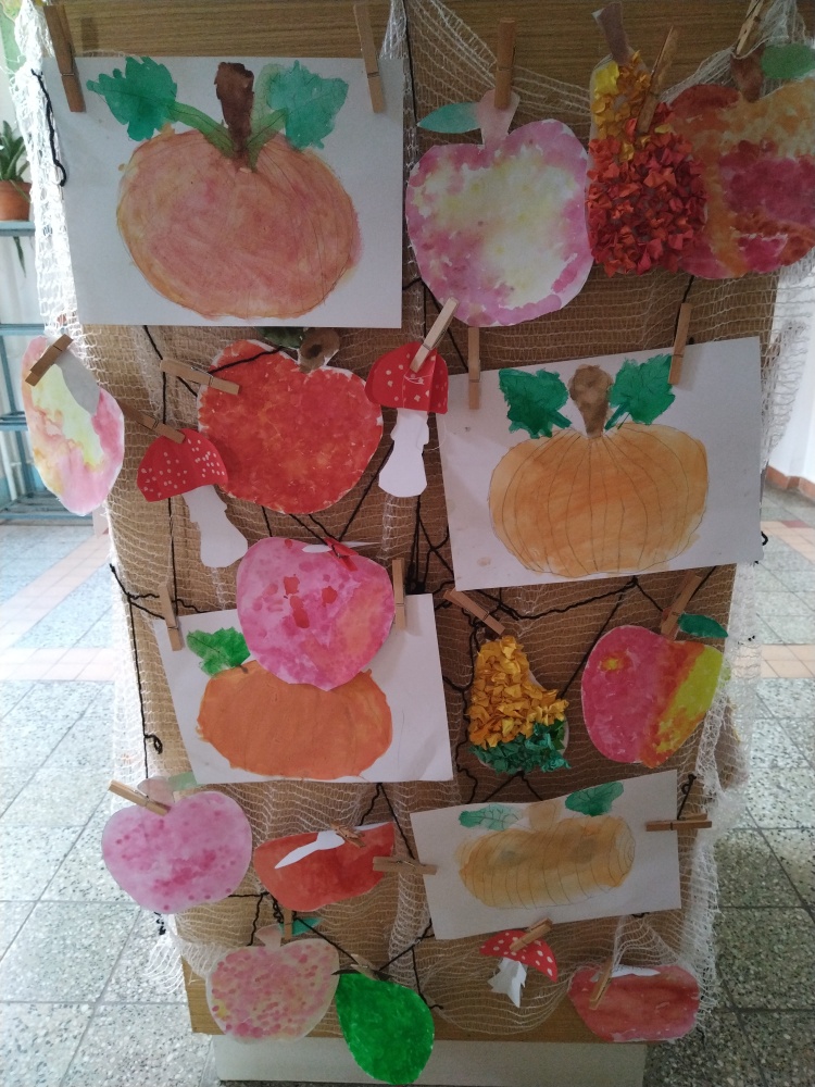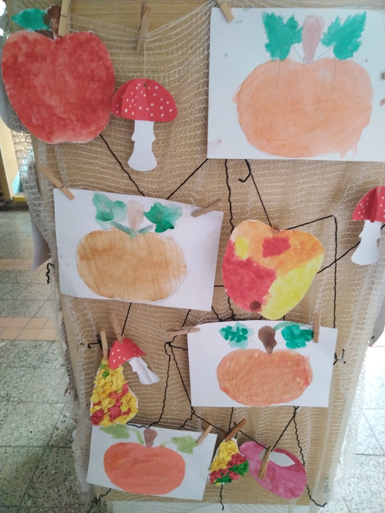 Jablíčka jsme tupovali houbičkou a hrušky jsou z papírové mozaiky ...
