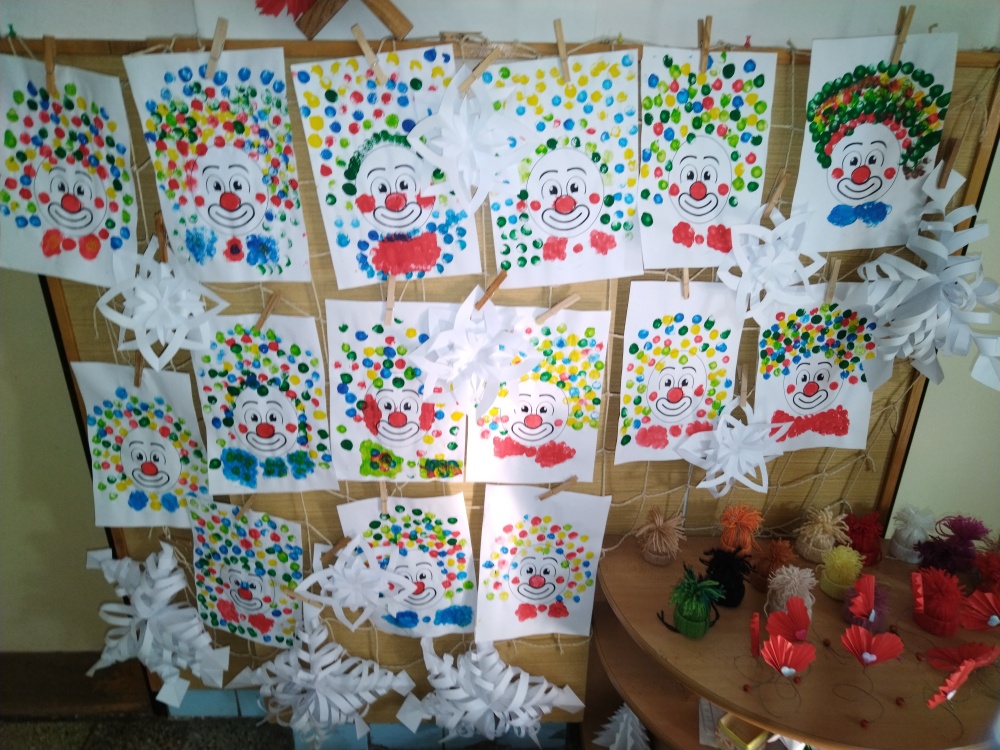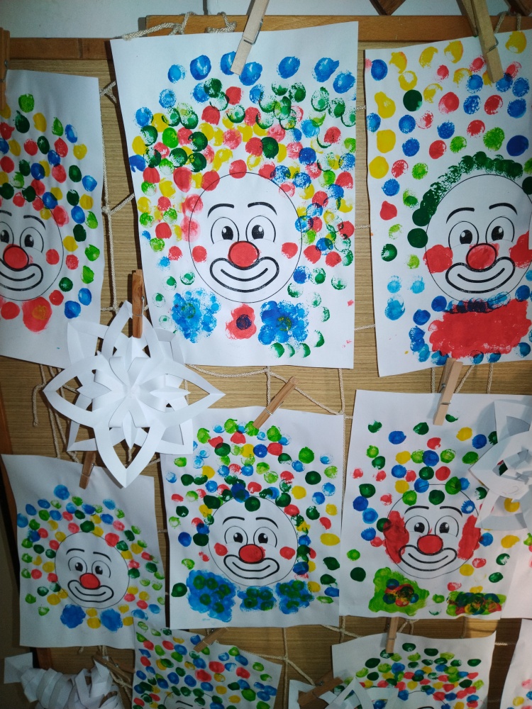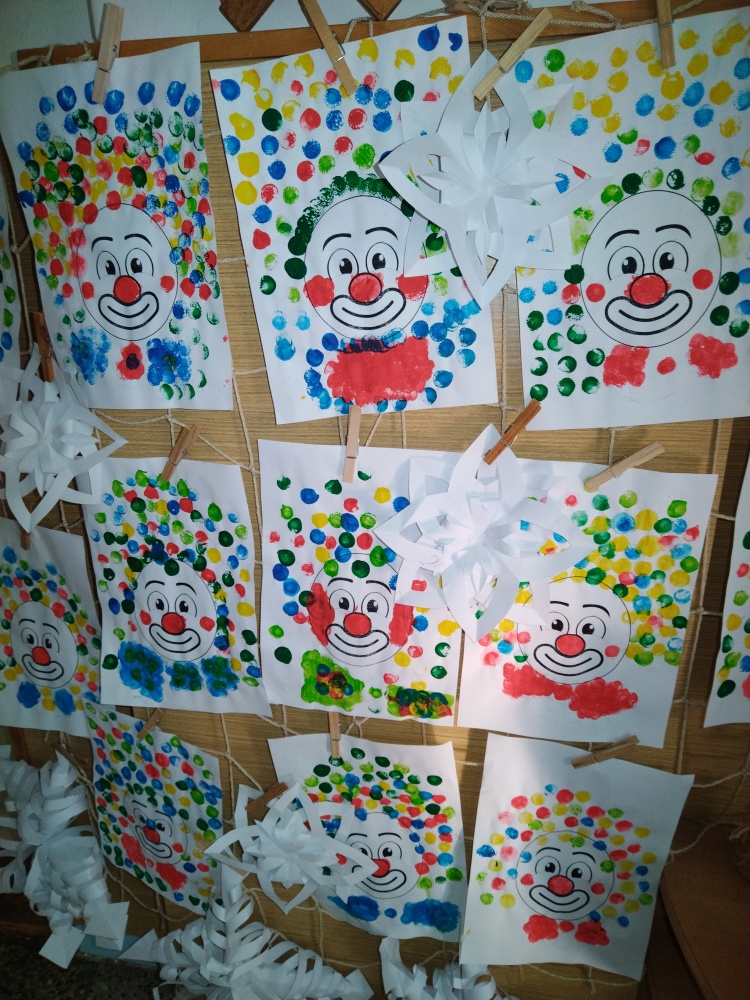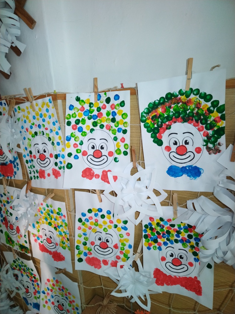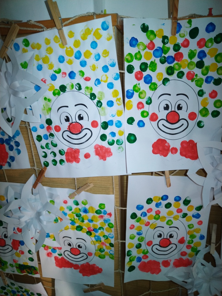 Ke karnevalu se hodí klauni, tak jsme si je namalovali pomocí otisků houbiček ...