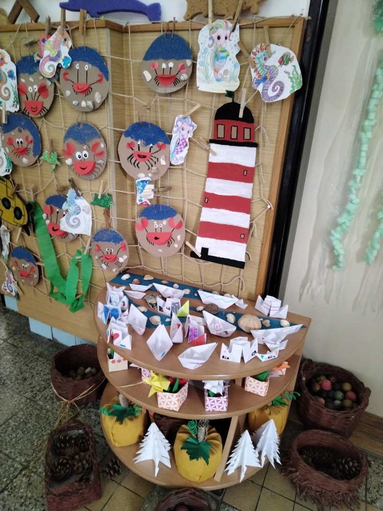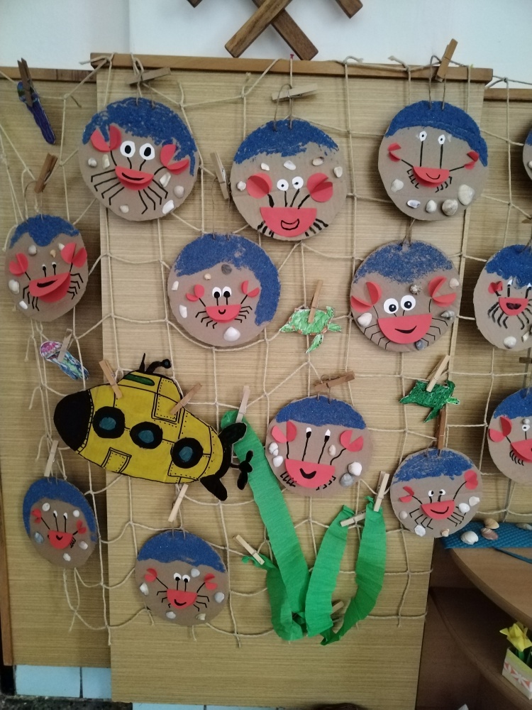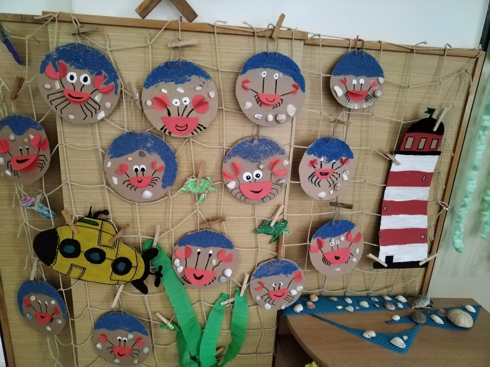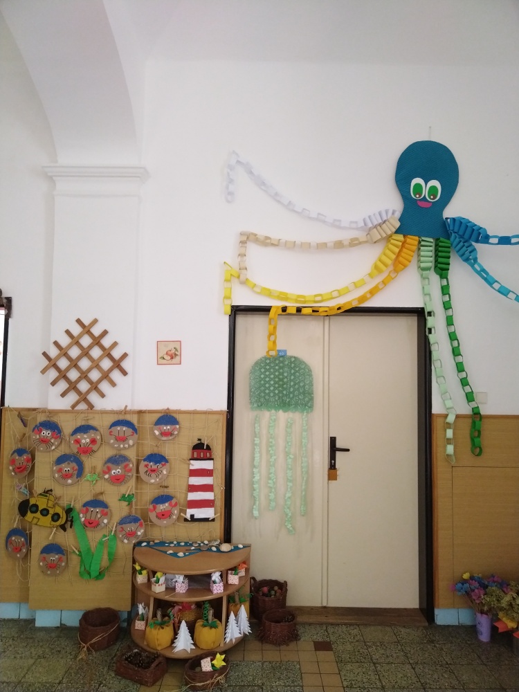 Naše výrobky na téma moře nám ozdobily prostor před školní družinou ...